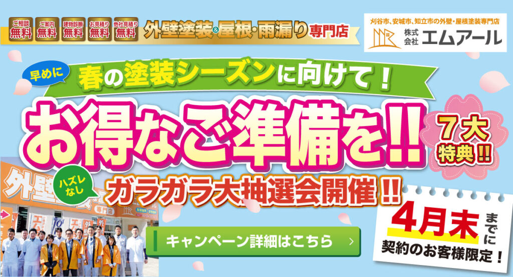 2026年3月春の塗装キャンペーン!刈谷市・安城市・知立市の外壁・屋根塗装専門店は株式会社エムアール 公開日:2026/03/16 最終更新日:2026/03/16 地元の皆様にご支持いただきエムアールは2025年で創業20周年を迎えることができました。2026年も地元から必要とされる企業となれるよう精一杯尽力して参ります。… 続きを読む