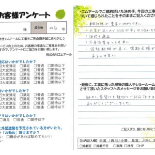 H様ありがとうございました。天候に恵まれ、2週間で全工程を終える事が出来ました。ご主人様が在宅勤務が多く、随時報告を行いながら施工できた事により、スムーズに工事を終えることができました。