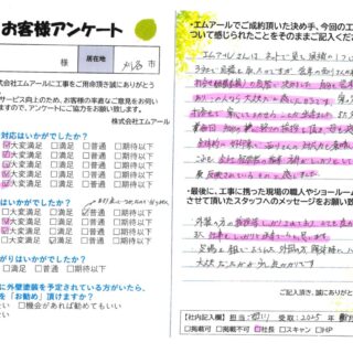 エムアールさんはネットで見て候補の一つにさせていただきました。3社で見積もりを取ったのですが、営業の西川さんが来られ、最初の打合せ(見積依頼)の段階で決めました。自分も営業の経験があり、この人なら大丈夫だと感じたからです。案の定しっかりした打合せで安心して任せることができました。また外装の方も毎回初めと終わりの挨拶をしていただき、母も感激していました。全体的に好印象で西川さんの対応力も素晴らしいと思います。これも会社経営者の指導・方針がしっかりとしていてそれが反映されているものと感じました。