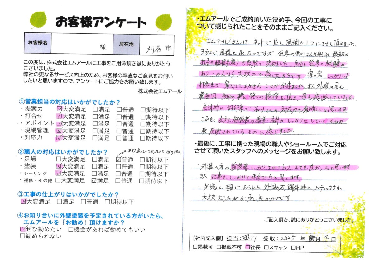 アンケートにご協力いただき、ありがとうございます。仕上がりに大変満足のご評価をいただきスタッフ・職人一同嬉しく思っております。会社の営業方針や私の対応にご信頼いただき、ご契約いただきましたこと担当者として何より嬉しく思います。塗装工事は何度も行うものではありませんので、お客様のご不安や不明なことを打合せの中でお伺いして解決し、安心してご契約いただき工事を迎えられることを大切にしております。工事では最後に手直しがあり、ご心配おかけして大変申し訳ございませんでした。職人についても気にかけていただき、ありがとうございます。今後も気になることがございましたらお気軽にご連絡ください。これからもお付き合いの程よろしくお願いいたします。