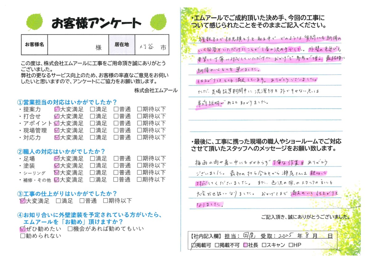 梅雨の雨や暑い中にもかかわらず、丁寧な作業をありがとうございました。最初の打合せから親切に対応してくださいました。また色決めの際のスタッフの方にも大変お世話になりました。おかげさまで満足のいく仕上がりになりました。