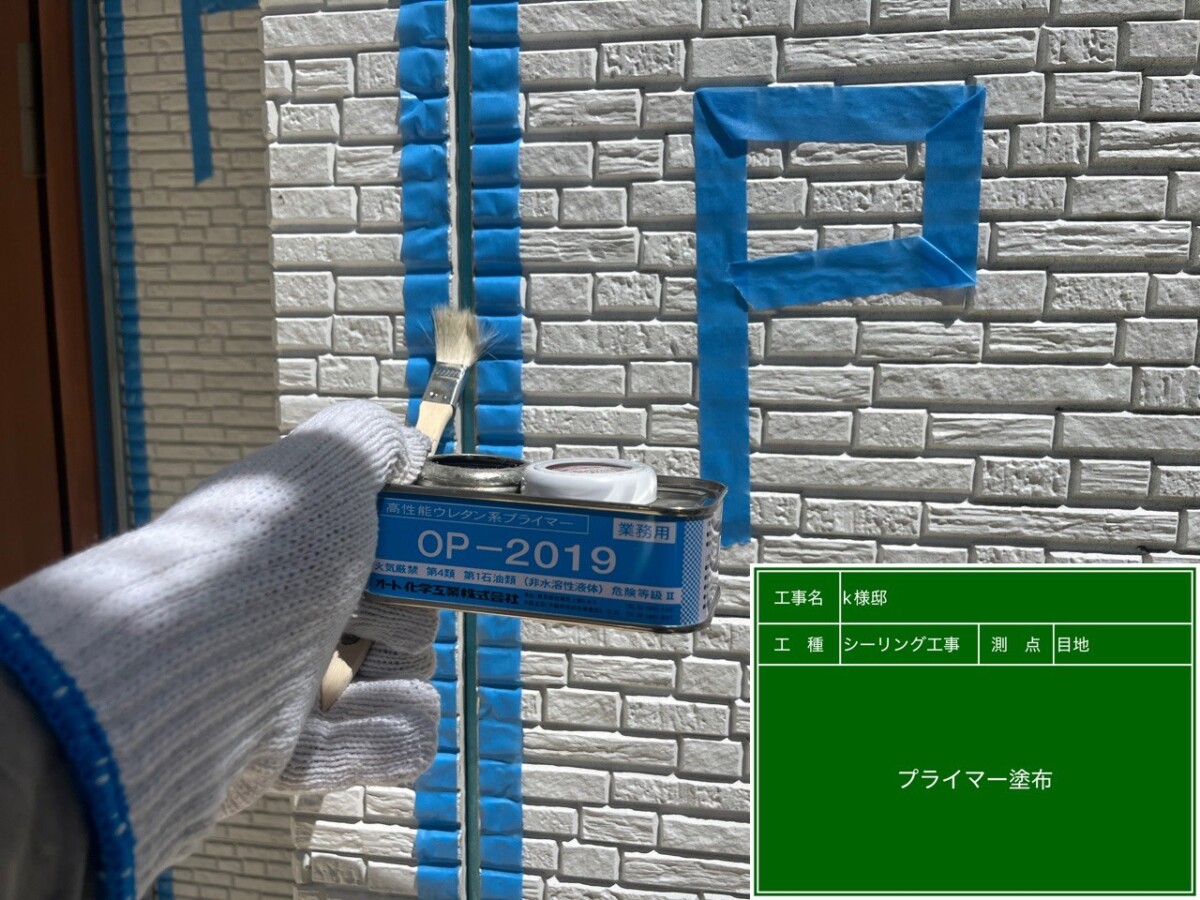シーリング材が外壁材とより密着するよう、プライマーを塗布します。