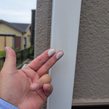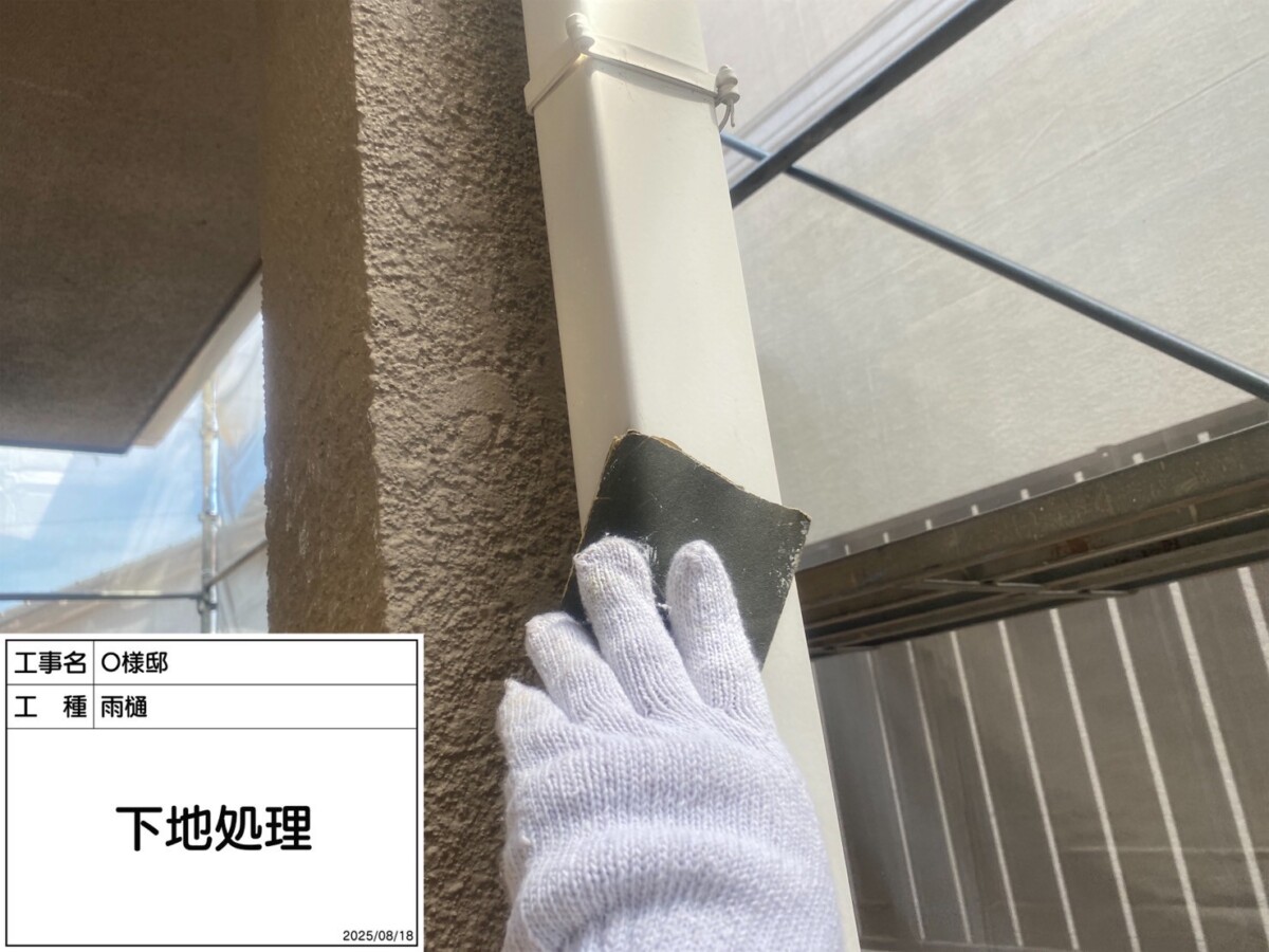 【チョーキング】が発生しています。雨樋は塩化ビニル製で劣化すると弾力性が失われ、破損の可能性が高まります。