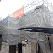 工事は足場組立から行います。安全に作業するためだけでなく、安定した作業場所を確保する事は施工品質を保つためにも重要です。安心して工事をお迎えいただけますよう、工事日までに担当者が近隣様へ工事のご挨拶をさせていただきます。