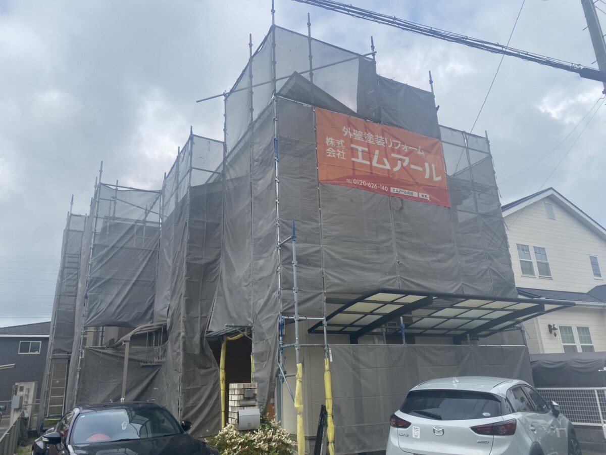 工事は足場組立から行います。安全に作業するためだけでなく、安定した作業場所を確保する事は施工品質を保つためにも重要です。安心して工事をお迎えいただけますよう、工事日までに担当者が近隣様へ工事のご挨拶をさせていただきます。