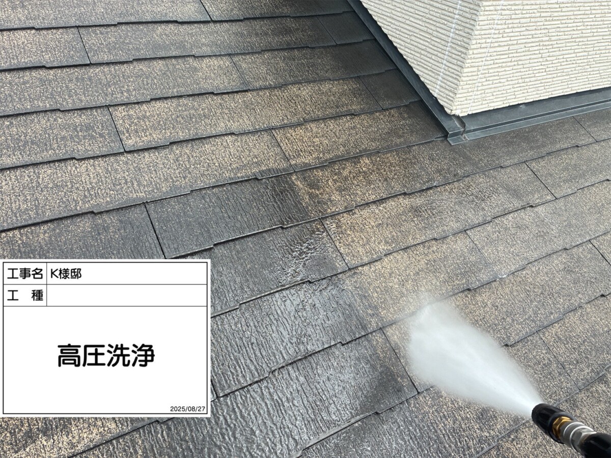 苔は水分を溜め込む習性があるので、高圧洗浄でしっかりと洗い流してから塗装する必要があります。