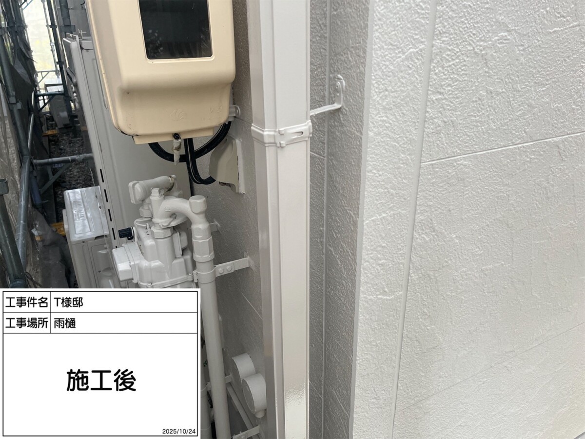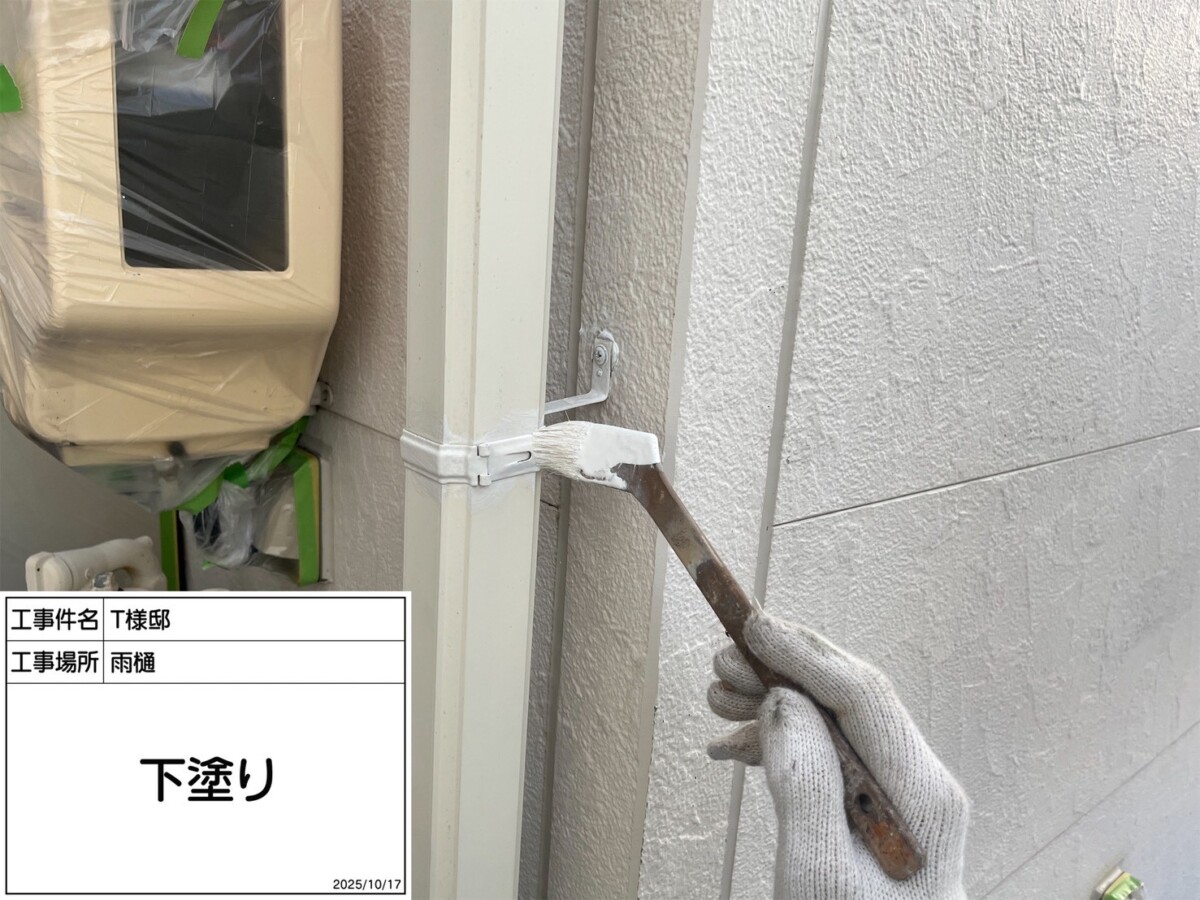 雨樋は掴み金具のみ金属製のため下塗りに錆止め効果のある下塗り材を使用します。掴み金物の錆が酷い場合や破損している場合は、交換や取付を行います。