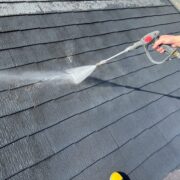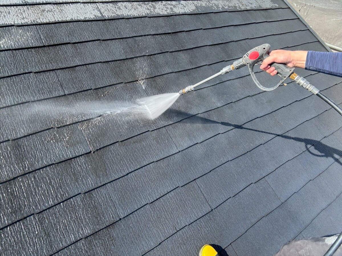 業務用の高圧洗浄機を使用し、長年積もった汚れや苔、古い塗膜なども綺麗に洗い落とします。塗装箇所だけでなく土間なども洗浄いたします。