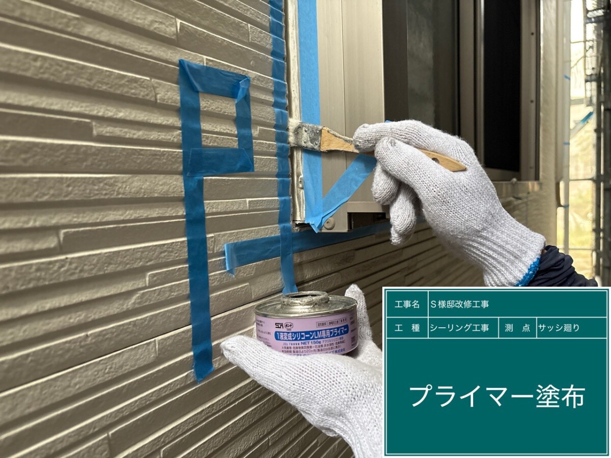シーリング材が外壁材とより密着するよう、プライマーを塗布します。