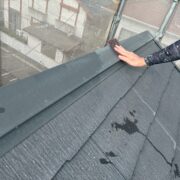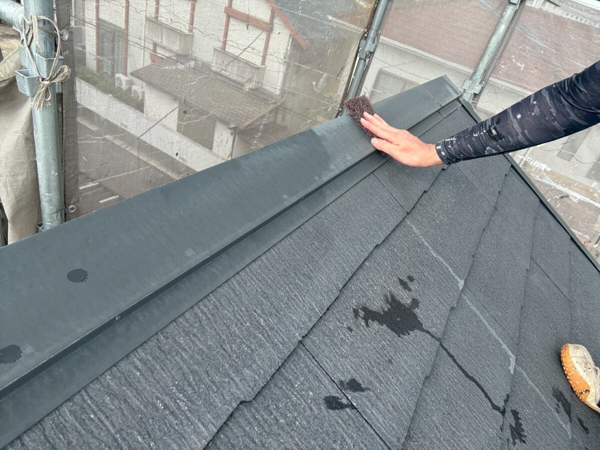 屋根の棟板金は金属製のため、ケレン作業を行い下塗りに錆止め効果のある塗料を使用する鉄部用の塗装作業を行います。ひび割れなどがある場合は補修を行い、屋根材に適した塗料を使用します。