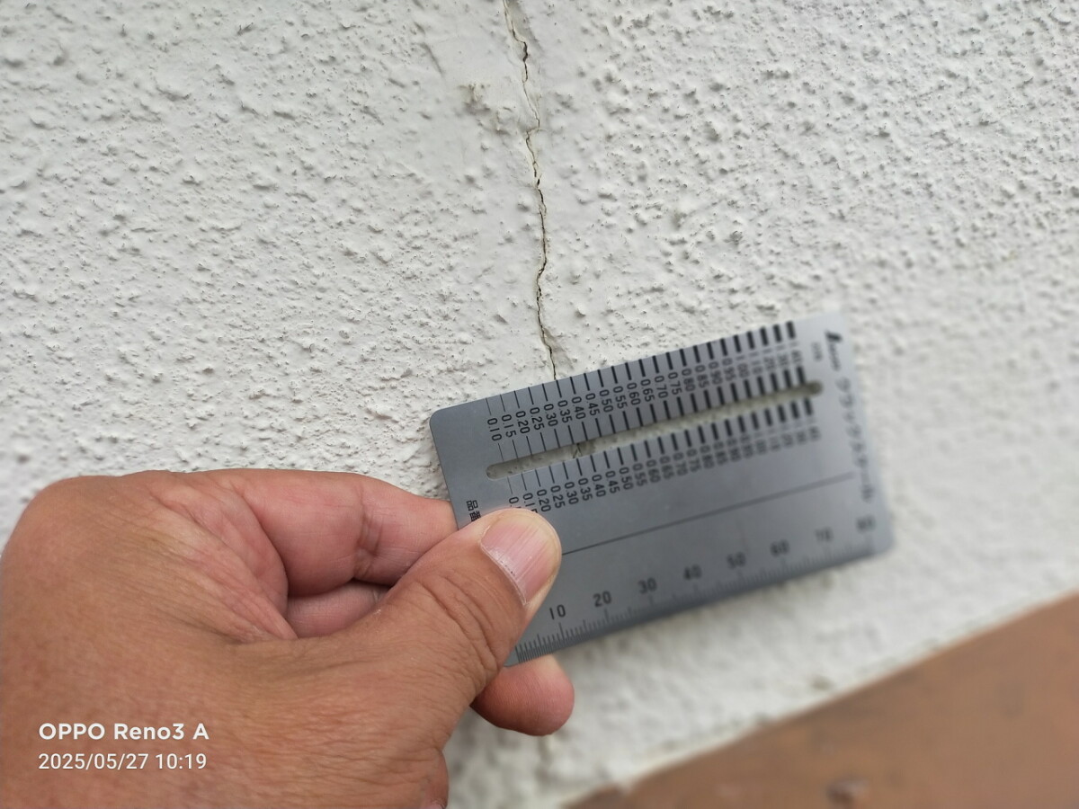 各所ケレン作業・養生作業・塗装前の処理作業を行います。ケレン作業はサビを落とすだけでなく、目荒らしすることで塗料の密着を高める効果もあります。窓など塗装しない箇所は養生を行い、塗料の飛散を防ぎます。外壁にひび割れが発生している場合は、補修を行ってから塗装します。