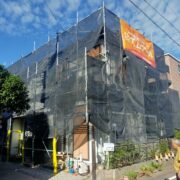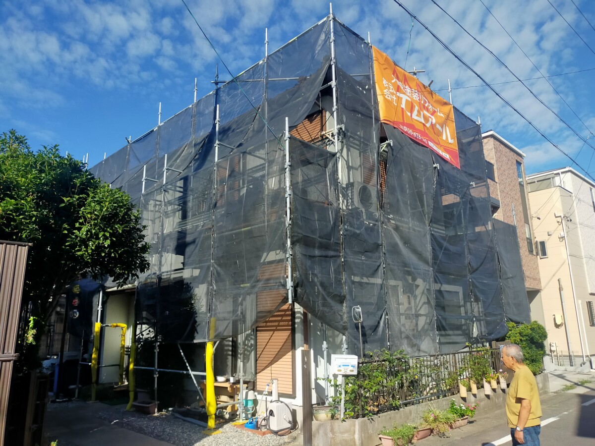 工事は足場組立から行います。安全に作業するためだけでなく、安定した作業場所を確保する事は施工品質を保つためにも重要です。安心して工事をお迎えいただけますよう、工事日までに担当者が近隣様へ工事のご挨拶をさせていただきます。
