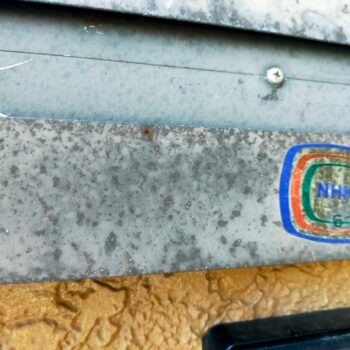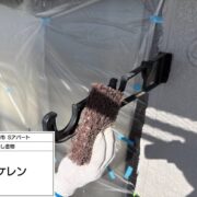 各所ケレン作業・養生作業・塗装前の処理作業を行います。ケレン作業はサビを落とすだけでなく、目荒らしすることで塗料の密着を高める効果もあります。窓など塗装しない箇所は養生を行い、塗料の飛散を防ぎます。