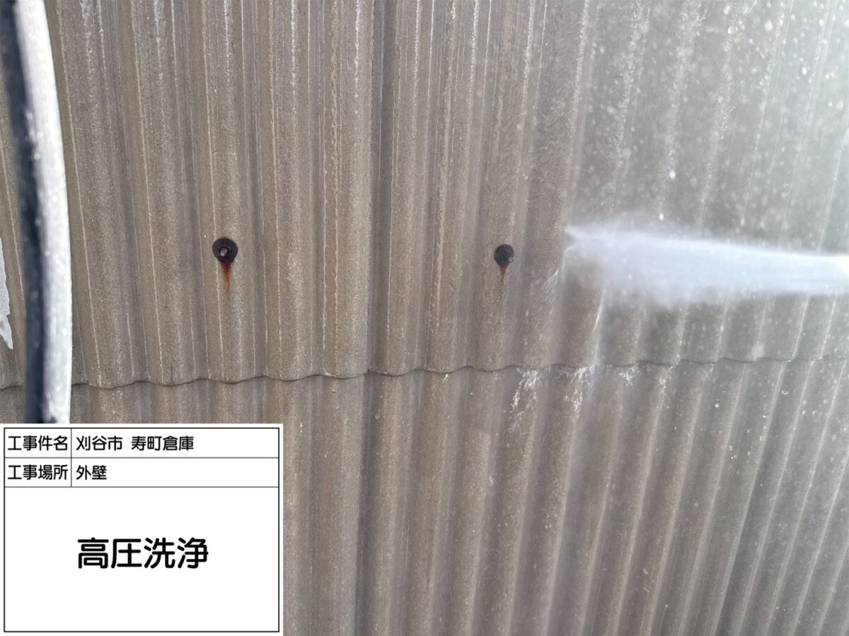 業務用の高圧洗浄機を使用し、長年積もった汚れや苔、古い塗膜なども綺麗に洗い落とします。塗装箇所だけでなく土間なども洗浄いたします。