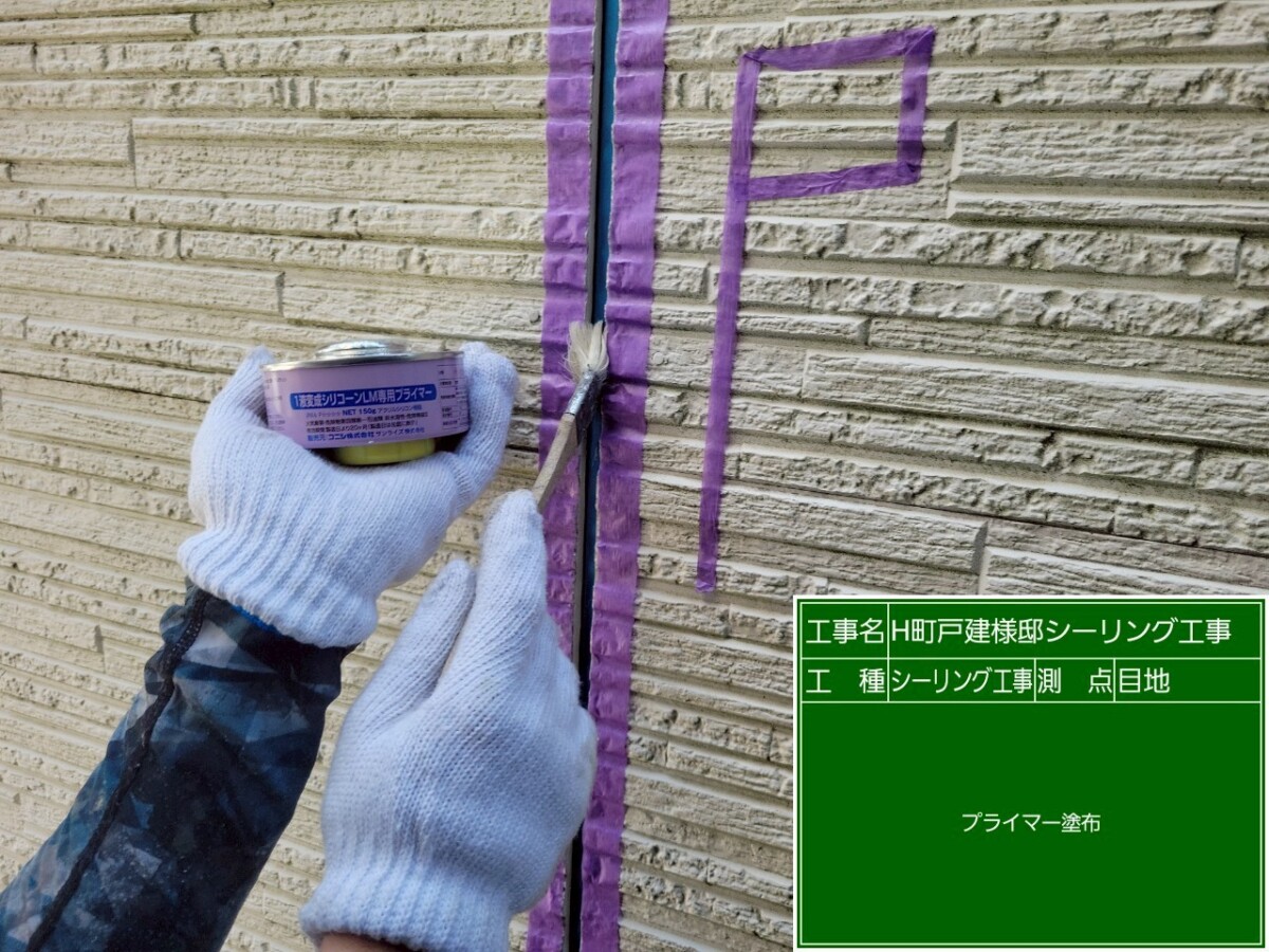 シーリング材が外壁材とより密着するよう、プライマーを塗布します。