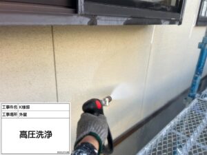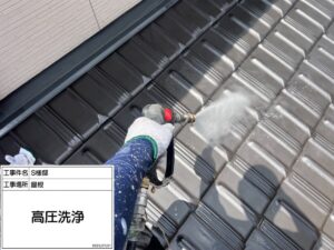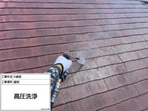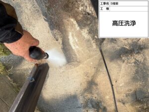 塗装作業に入る前に、高圧洗浄機を使用して長年積もった汚れやコケなどを洗い落としていきます。