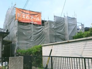 着工前に近隣様へのご挨拶を行い、まずは足場組立から工事を始めます。