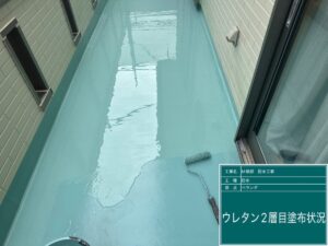 戸建て住宅のベランダはウレタン塗膜防水が施工されていることが多いです。ウレタン防水は非常に耐久性に優れていますが、防水層は紫外線に弱く表面を保護しているトップコートの劣化に注意が必要です。防水層が劣化してしまっている場合は、新しい防水層を施工する必要があります。