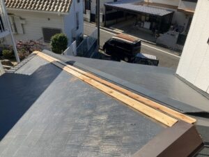 雨漏り箇所が特定できれば、ブルーシートで一時的に覆います。重しやロープでしっかり固定し、風で飛ばされないようにしましょう。