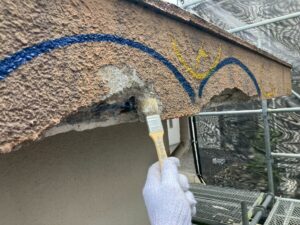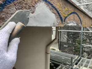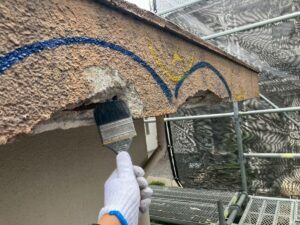 補修部分を削ってから清掃し、プライマーを塗布してからモルタルで爆裂部分を成型します。深い亀裂や外壁の角が削れているような場合でもモルタルで形をつくることが出来ます。