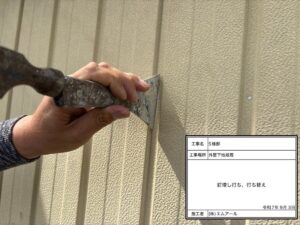 釘打ち・交換:金属系外壁で外壁材を固定している釘が浮いてしまっている場合は打込み、錆が発生しているものは交換するなどの作業を塗装前に行います。交換してから塗装することで塗膜で釘を保護することができ、錆にくくなります。