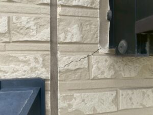 窓やドアといった「開口部」は特にひび割れが起こりやすい箇所です。建物の揺れや動き、歪みなどによる負荷がかかりやすく、角の部分にひび割れが起こることが多いといえます。外壁と窓など異なる部材が取り付けられた部分であり、建物の中と外が繋がっている部分でもあるため雨漏りの原因にもなりやすい箇所です。外壁材の劣化により負荷に耐えられなくなることや、窓周りに施工されているシーリングの劣化により建物の動きなどの負荷を軽減する作用が減ることなどが原因といえます。