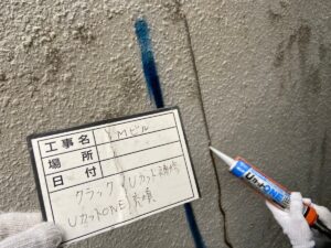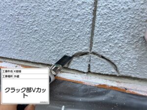 ひび割れの幅・深さによって処理方法が変わります。ひび割れの幅や深さが軽度である場合は、塗装工事の工程で窓周りのシーリングを施工する際にシーリング材を充填し補修した後、塗装の工程に入ります。亀裂が深い場合はそのまま補修材を埋め込んでも亀裂の端まで埋めることができるかわかりません。その場合はクラック箇所に切り込みを入れ、しっかりと充填幅を確保してから補修材を埋め込む「Vカット」・「Uカット」という作業を行います。