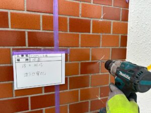 タイル外壁については、ひび割れ補修の他に浮き補修があります。これは、タイルが下地から浮いている状態のため、剥がれ落ちないように固定する補修です。穴をあけてエポキシ樹脂をタイル裏に注入し、空洞を埋める作業を行います。