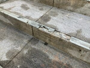 コンクリート内部の鉄筋が錆びて膨張することで周囲のコンクリートが押し出され、表面が剥がれたりひび割れが発生してしまいます。これを主に「爆裂」と呼びます。爆発したように見えることからこう呼ばれますが、鉄筋の膨張による圧力でコンクリートが破損する現象です。爆裂が進行すると、表面が剥がれるだけでなくコンクリートが欠け落ちて内部鉄骨が剥き出しになってしまうこともあるため補修は必須です。
