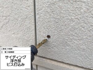 外壁の浮き・反り:反りが軽度であればビスを打ち込んで固定する作業を行う事で補修が可能です。しかし、反りが大きい場合は無理に固定しようとすると反動で外壁材が割れてしまう可能性があります。また、固定したビスが錆てしまわないようシーリング材などで保護しておくことも大切です。