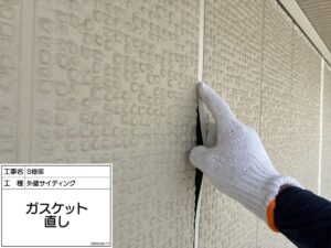 ガスケット処理:外壁目地をシーリングではなく「ガスケット」と呼ばれる部材で埋めている建物があります。ガスケットが浮いていたり外れてしまっている場合ははめ直し、塗料の剥がれを防ぐためガスケットに適した下塗り材を塗布してから塗装を行います。