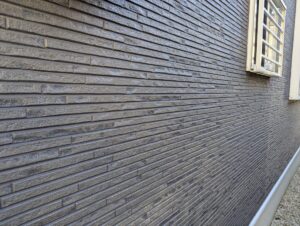 こちらも19-50Aの施工事例です。ストーン調の柄のあるサイデイング外壁が施工されていますが、塗装で柄は単色になってしまいます。柄をつける塗装方法もありますが、刈谷市K様は単色での施工を選ばれました。外壁材にもともとある凹凸は塗装してもそのまま残るため、単色でも陰影のある仕上がりにはなります。付帯部は一般的な白であるN-90で統一され、柔らかい印象のグレーの塗装になっているかと思います。