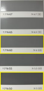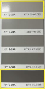 色見本で見比べるとそれぞれの色の微妙な違いがわかりますが、シミュレーション画面やその色単体で見るとさほど差がないように感じます。色を決める際は、全体の印象はシミュレーションで、細かな色の差は色見本で確認することが大切です。