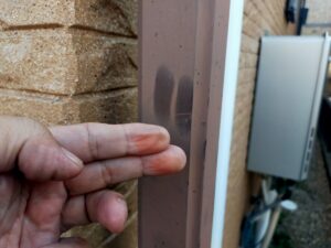 刈谷市S様のお家の外壁目地、サッシ周りにはシーリングが施工されています。外壁目地・サッシ周りのシーリングともに<ブリード現象>が発生しています。ブリード現象とはシーリング材に含まれる可塑剤が劣化することで浮き出た油分に埃や塵が付着することで黒ずむ現象のことです。