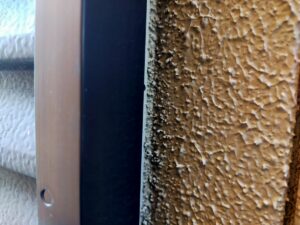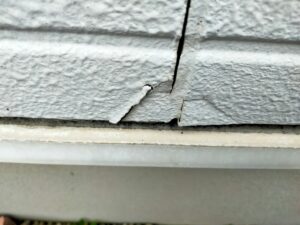 刈谷市S様のお家はサイディング外壁です。砂の混じった石目のようなデザインです。<塗膜剥離>や<クラック(ひび割れ)>が見受けられました。また、隙間ができてしまっている箇所があり雨水などの侵入が懸念されます。