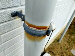 雨樋・雨戸・土台水切りなど各所に<チョーキング現象>や<色褪せ>が発生していました。また、雨樋の掴み金物に<錆>が発生しています。