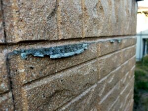 刈谷市S様のお家の外壁目地、サッシ周りにはシーリングが施工されています。外壁目地・サッシ周りのシーリングともに<ブリード現象>が発生しています。ブリード現象とはシーリング材に含まれる可塑剤が劣化することで浮き出た油分に埃や塵が付着することで黒ずむ現象のことです。