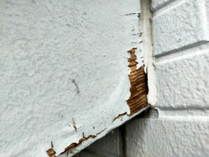 雨樋・土台水切り・シャッターBOX・勝手口庇など各所に<チョーキング現象>や<色褪せ>が見受けられました。雨樋は、劣化が進み塩化ビニールの弾力性が低くなると破損の可能性が高まります。付帯部の塗装も重要です。