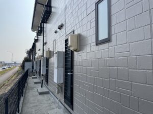 岡崎市集合住宅S様はサイディング外壁です。塗装から1年が経ちましたが、艶もあり良好な状態です。