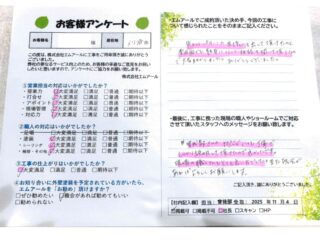 知人に教えていただき「エムアールでやったよ」と言われたのでショールームまで行かせていただきました。いろんな色を提案していただき納得できるまで試すことができとても満足しました。質問もすぐに返答がくるので工事中も助かりました。海外にいる父にもL……