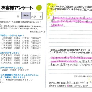 一番暑い時期の施工でしたので、普段開けている窓を開けることができなかったことは、申し訳なく感じております。今後はお客様の生活スタイルを極力損なわないよう、ヒアリングとご提案を今以上に心がけていくよう努力します。この度は誠にありがとうございました。
