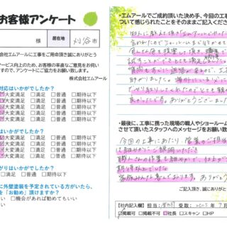 この度は弊社に施工をお任せいただき誠にありがとうございました。工事中は、海外在住のお父様のご心配、ご不安にならないよう画像を共有するなど随時ご連絡を取らせていただきました。可能な限りお客様に寄り添う工事ができればと思っておりますので、大変満足の声をいただき嬉しい限りです。今後もK様のように喜んでいただける工事を提供し、K様が知人の方からの口コミで弊社にお越しいただいたように、弊社の施工をきっかけに輪が広がっていくことを目指しております。刈谷市を中心に地元優先・地元密着で地元の皆様に必要とされるよう取り組んで参ります。また1年後に定期点検にて、ご家族様のお顔が見られることを楽しみにしております。