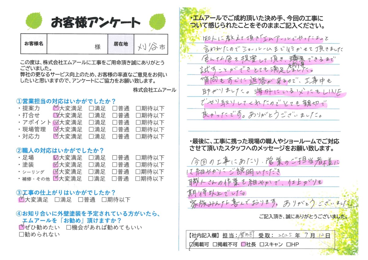 知人に教えていただき「エムアールでやったよ」と言われたのでショールームまで行かせていただきました。いろんな色を提案していただき納得できるまで試すことができとても満足しました。質問もすぐに返答がくるので工事中も助かりました。海外にいる父にもLINEでやり取りしてくれたのでとても親切で良かったです。ありがとうございました。