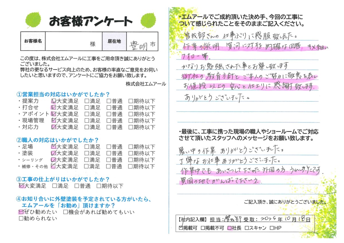 曽我部さんの仕事ぶりに感服いたしました。作業の説明、質問に対する的確な回答、きめ細かいフォロー等。かなりお勉強されたこととお察しいたします。御社の教育方針と御本人のご協力に敬意を表しお値段以上の安心と仕上がりに感謝致します。ありがとうございました。