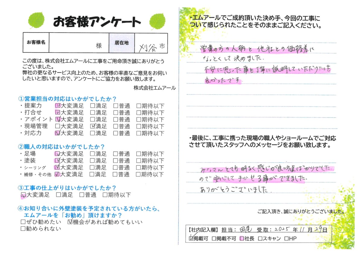 見積りの段階から丁寧に対応していただき施工中も点検等安心してお願いすることが出来ました。地元密着の信頼できる塗装会社だと思います。 【スタッフへのメッセージ】 職人さん達は皆さん礼儀正しく丁寧に仕……刈谷市 知立市 大府市 高浜市 碧南市 安城市 外壁塗装 外壁リフォーム シーリング コーキング 屋根塗装 防水工事 瑕疵保険 施工実績 地元密着 無料診断 アフターサービス 自社施工管理 ショールーム