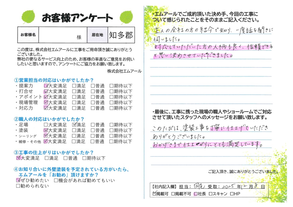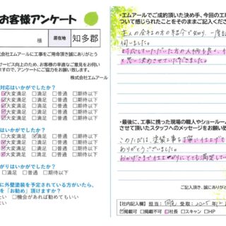 営業の方の説明が良かった。 【スタッフへのメッセージ】 計画通り工事も進めて頂き大変良かったです。アフターフォローもしっかり出来ており信頼できました。刈谷市 知立市 大府市 高浜市 碧南市 安城市 外壁塗装 外壁リフォーム シーリング コーキング 屋根塗装 防水工事 瑕疵保険 施工実績 地元密着 無料診断 アフターサービス 自社施工管理 ショールーム