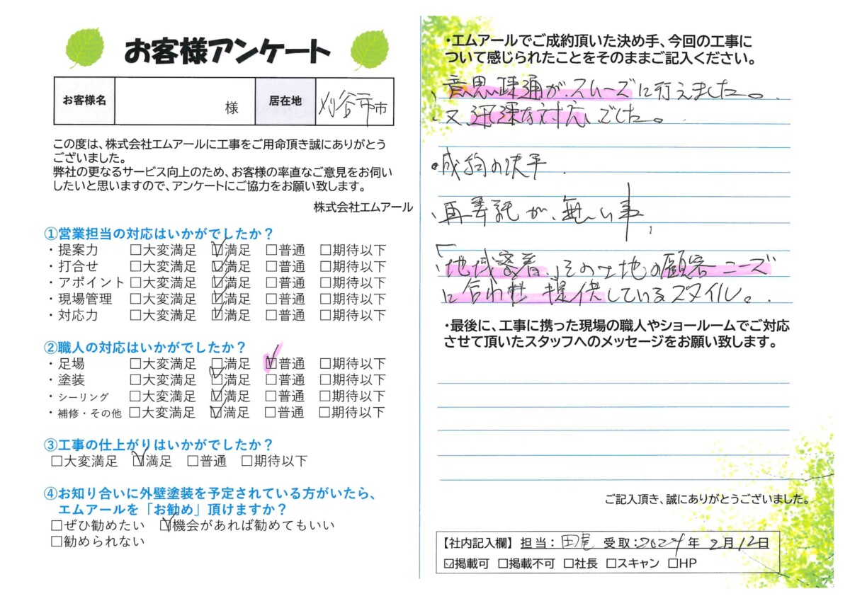 他社と見積りは取りましたが、提案力価格や工事の品質等全てにおいて、満足しております。ありがとうございました。 【スタッフへのメッセージ】 何も不満はありません。有難うございました。