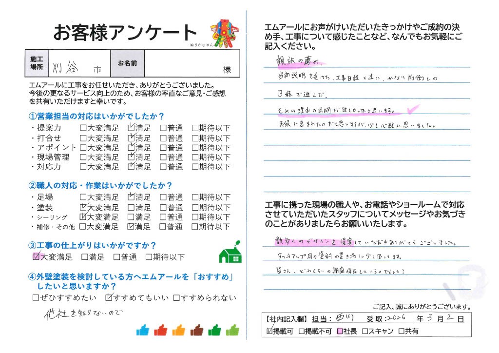 営業の人がいい人で対応の方も十分でとても分かりやすい説明と小まめに連絡をくれて、色々相談に乗ってくれたので決めようと思いました。 【スタッフへのメッセージ】 現場の職人さんがとても丁寧でいい仕事を……刈谷市 知立市 大府市 高浜市 碧南市 安城市 外壁塗装 外壁リフォーム シーリング コーキング 屋根塗装 防水工事 瑕疵保険 施工実績 地元密着 無料診断 アフターサービス 自社施工管理 ショールーム