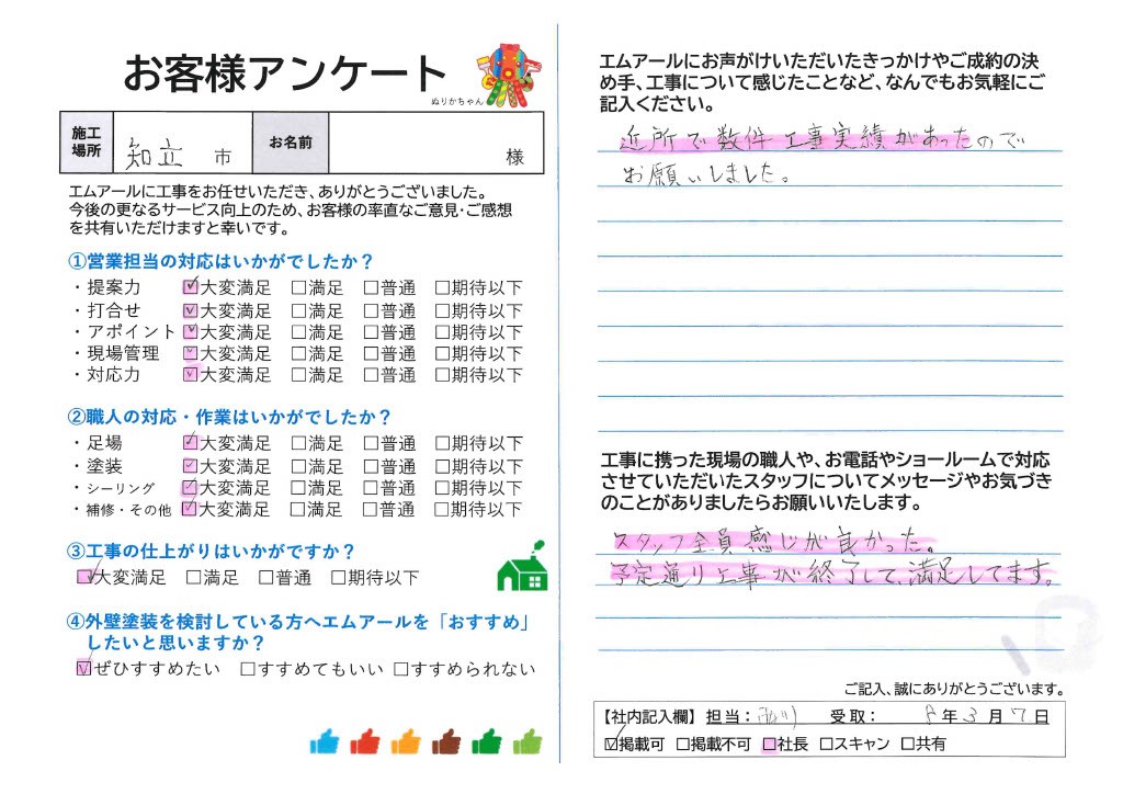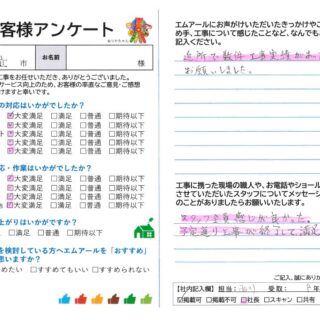 アンケートご記入いただき、ありがとうございました。また、工事にもご満足の評価をいただき弊社スタッフ、職人とも喜ばしく感じております。近隣での施工実績を見てお問合せをいただいたとのこと、地元密着で地域の皆様に必要とされる会社を目指す弊社にとって大変うれしいきっかけです。これからもどのお客様にもご満足いただける工事をご提供できるよう精進していきます。どんな些細な事でも気になること御座いましたらご連絡ください、すぐにお伺いできるようエムアールは地域密着・地元優先でお受けしております。今後も長いお付き合いとなりますよう、よろしくお願いいたします。